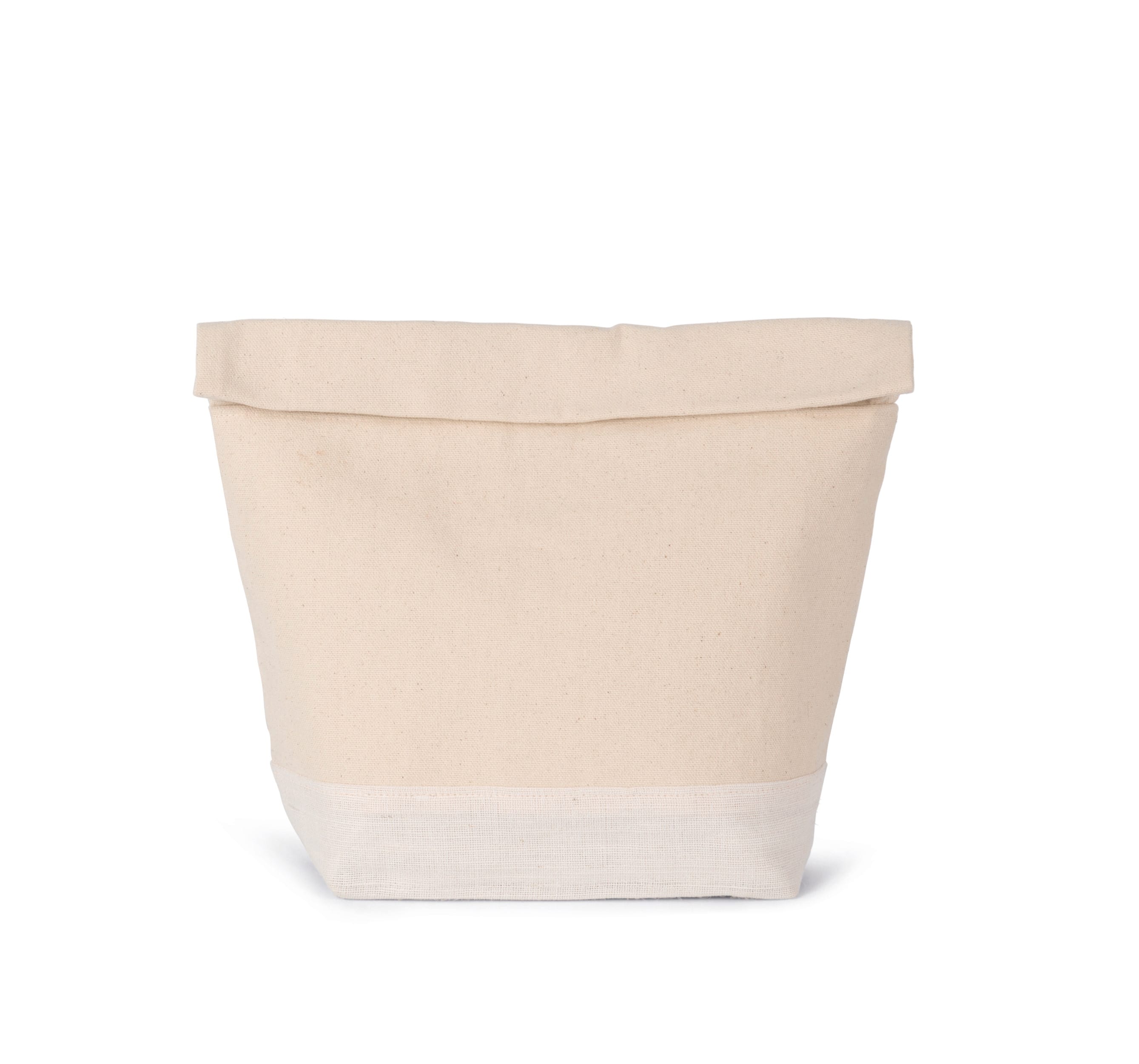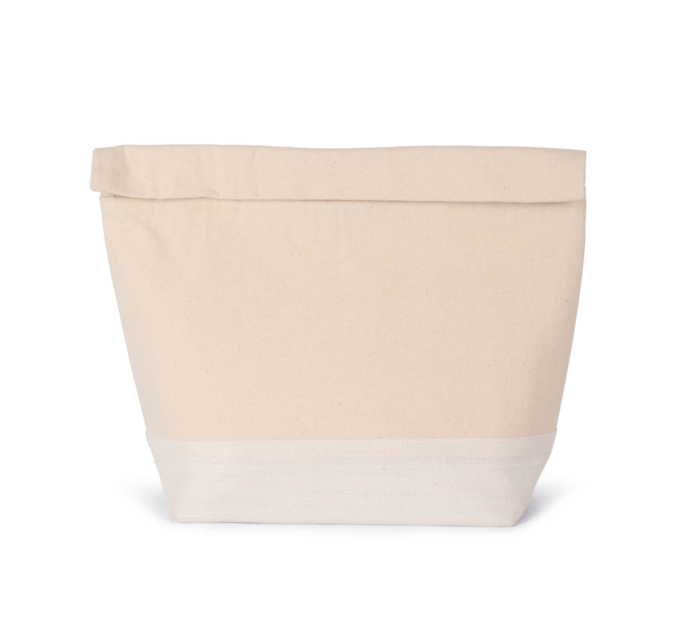 100% cotton. Cotton bag with roll-top closure and hook-and-loop fastener for a straight silhouette and easy decoration access. Different sizes to meet all needs.